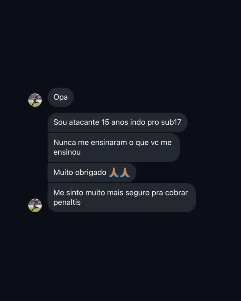 Agora, estou há mais de 6 anos e quase 30 cobranças em competições, sem errar um pênalti - e o mesmo foi feito com meus alunos.